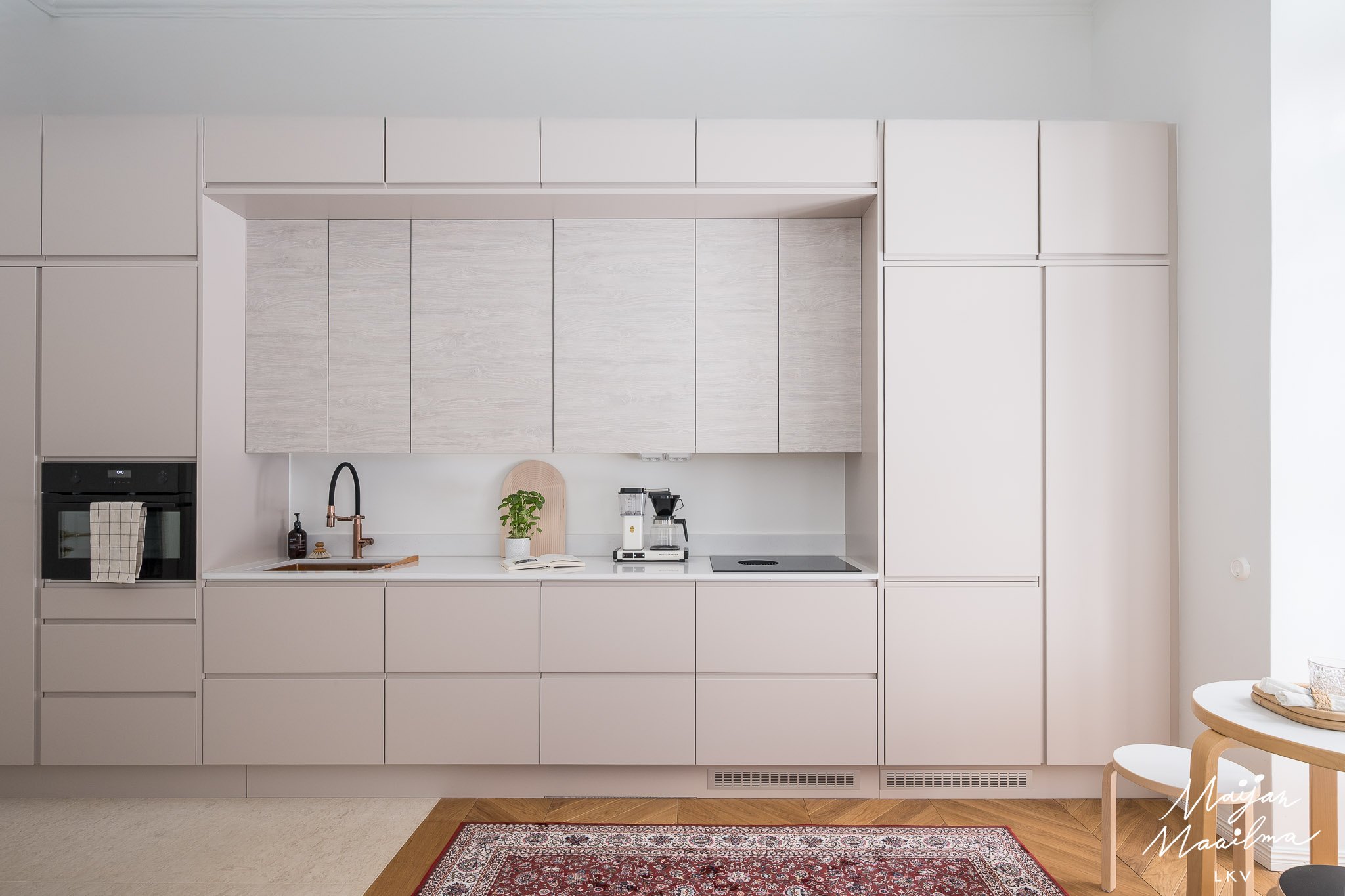 Huonekokoonpano 3 h + k + kph + halli, kodinhoitosyvennys, walk-in-closet-vaatehuone ja pukeutumistila. Asunto muodostuu kahdesta toisiinsa yhdistetystä huoneistosta.